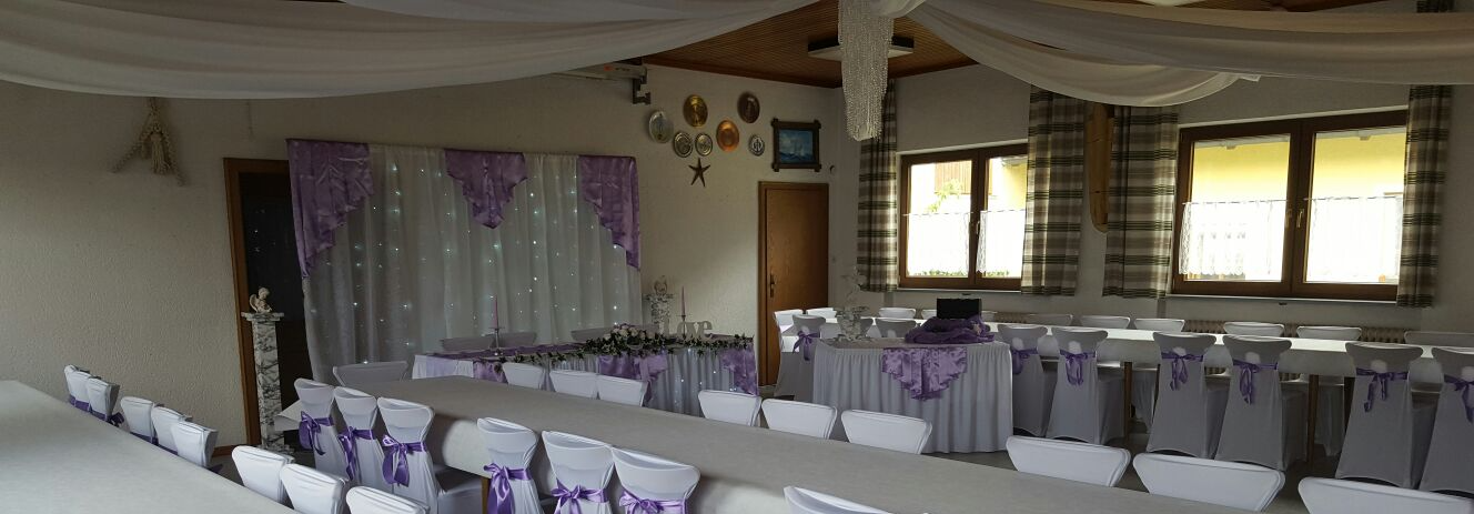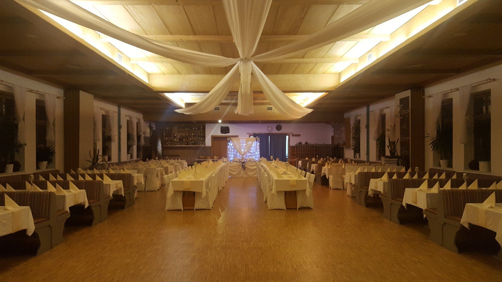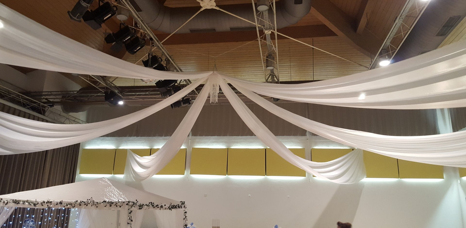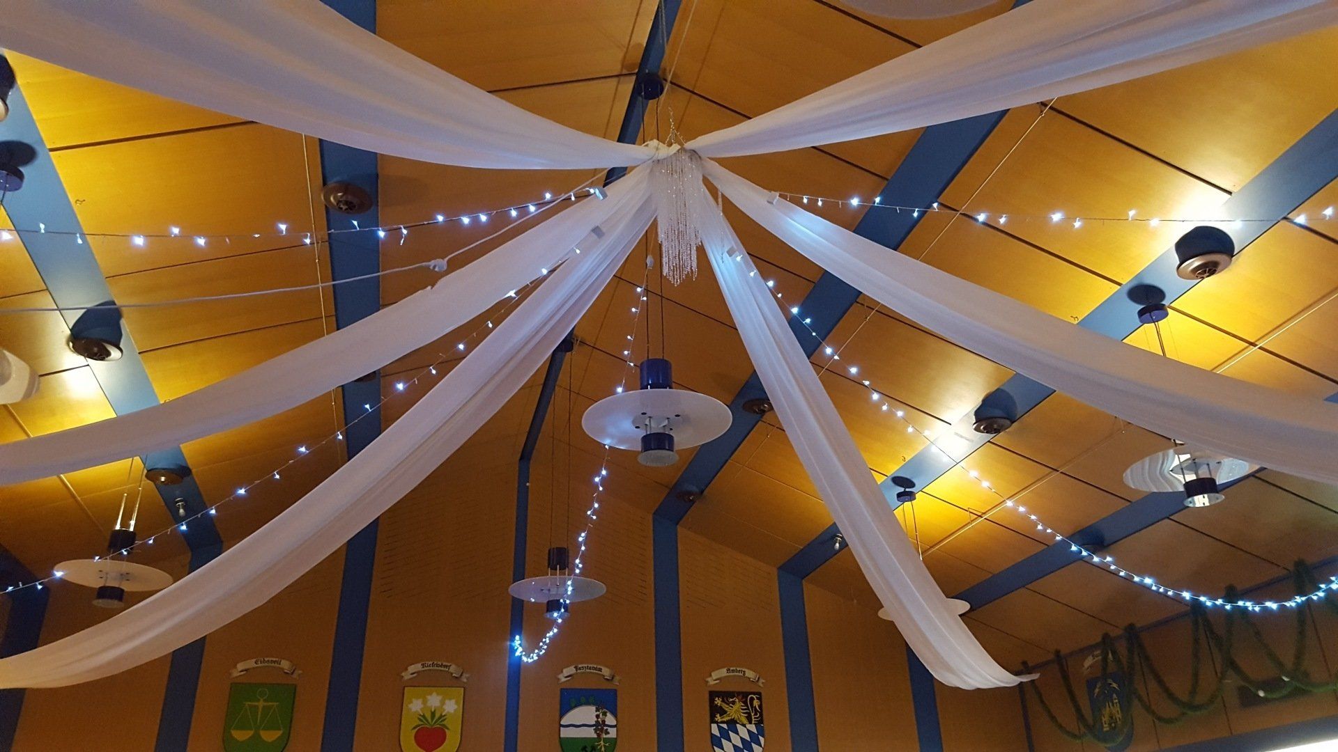 Eine Deckendekoration mit Stoffbahnen und/oder LED Lichterketten sind ein besonderer Blickfang auf ihrer Feier.